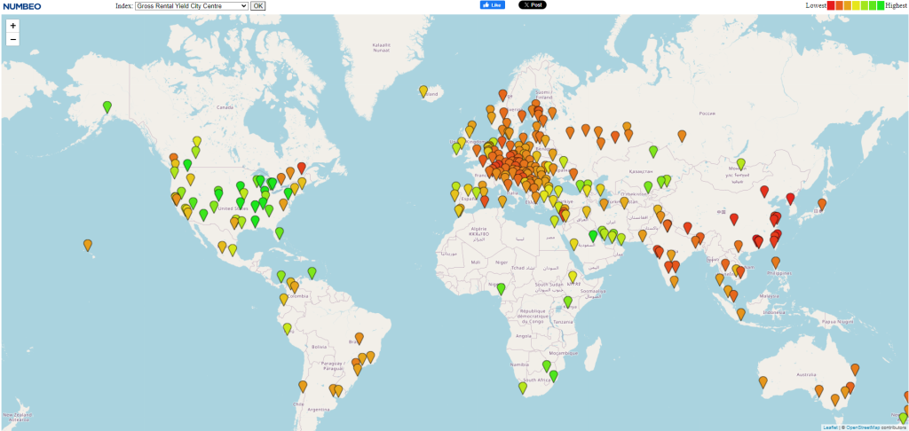 美國的話,Seattle 5.65%、New York 5.55%、L.A 7.23%、Miami 10.88%。而部分治安不好的城市像是Detroit是…高到嚇人的32.93%。Yield最低的是San Jose的4.32%。整體美國大城市Gross Rental Yield落在5~10%年不等。