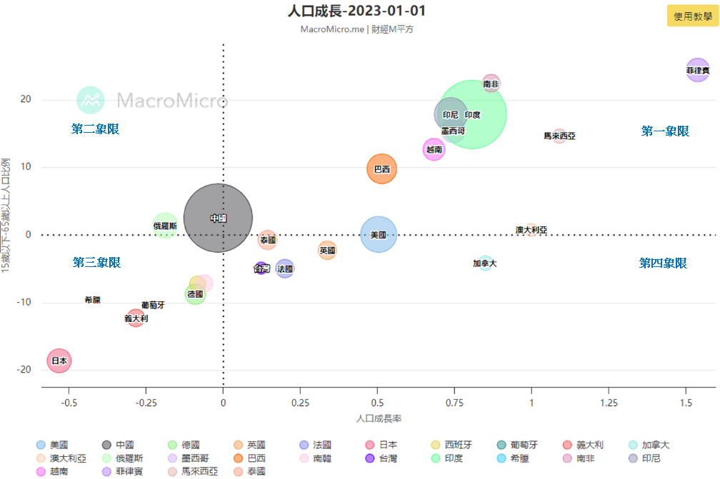 2023年勞動人口象限現況。圈圈越大代表勞動人口基數越多。而第一象限是最好的人口結構。第三象限是最不好的人口結構,老化、人口減少。第四象限是總人口維持正成長,但人口老化。
