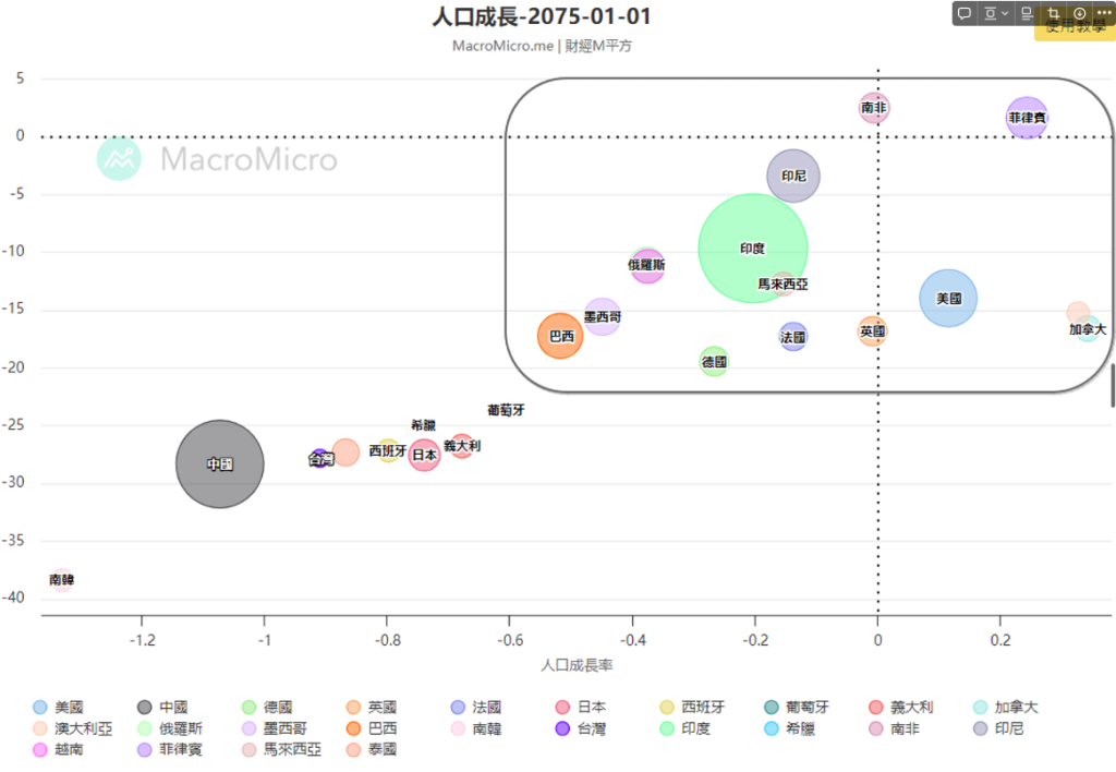 而可以明顯看到大部分國家都跑到第三象限了! 所以以現在人口推估,未來幾十年如果沒有戰爭等人為事件影響,大概率先進發達國家仍會持續搶人大作戰。只是搶人的標準等可能和過去差很多。
