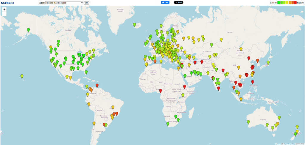 這邊以房價除以年收入當作一個基準判定標準。下圖是來自NUMBEO網站的資料。 綠色代表Price to Income ratio低,民眾負擔低,紅色代表Price to Income ratio高,民眾負擔高