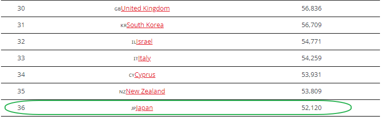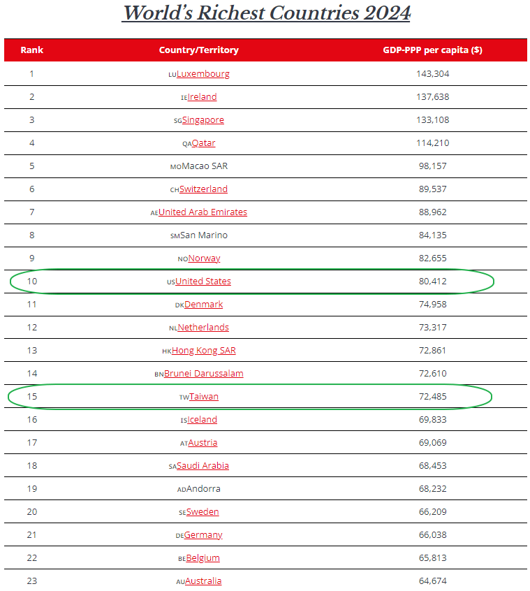 下圖資料是來自 global finance做的調查,來比紹各國國家民眾的有錢多寡。做法是用人均GDP用PPP購買力平價方式表示,以希望降低各國幣值與生活基本費用的差異。
