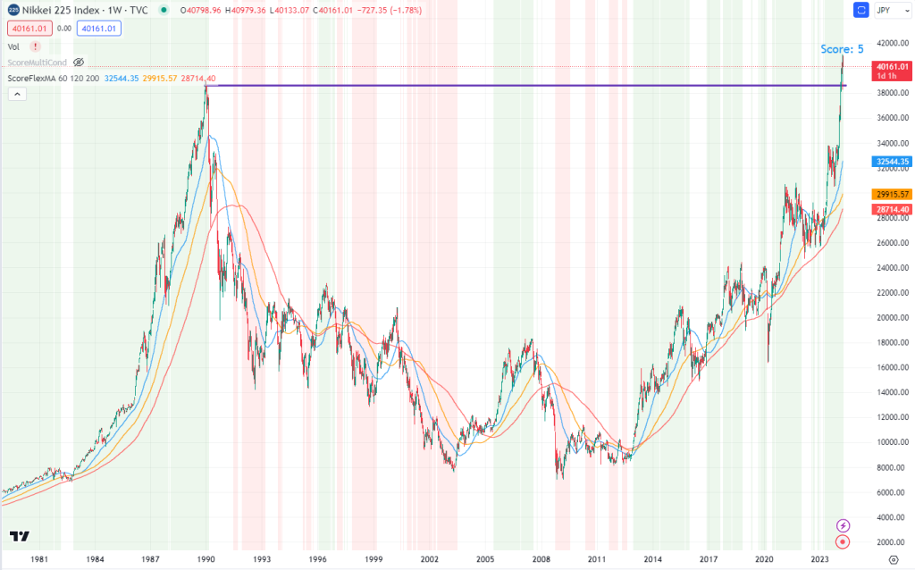 與此同時日經225指數在2024年2月底也正式超越1989年12月29日禮拜五的38900歷史價位。請參考下圖日經225指數